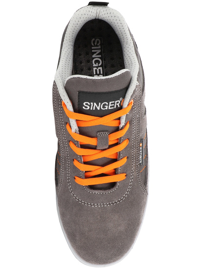 Forro de malha. Entressola anti-punção não metálica e ponta anti-choque composta. Palmilha de limpeza perfurada em EVA totalmente removível, antistática. Aperto por atacadores e cravos planos. Use sola em PU de dupla densidade. Forro cor cinza. Atacadores cor laranja e cinza para escolher, costura cor laranja.