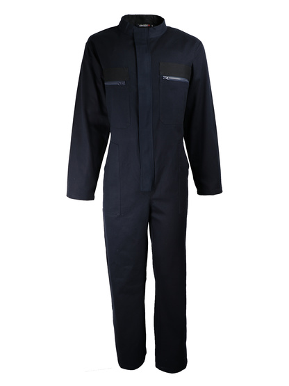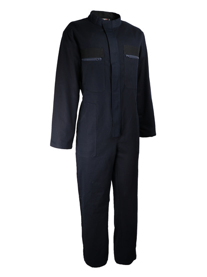 [Os Imperdíveis] . 100% algodão. 300 g/m2. Colarinho direito. Zíper de plástico central. 2 bolsos torácíveis, fecho zip plástico. 2 bolsos em um ângulo para a cintura. Um bolso traseiro. Bolso de 1 metro na perna direita. Aperto elástico nas costas. Azul/preto de tinta de dois tons.