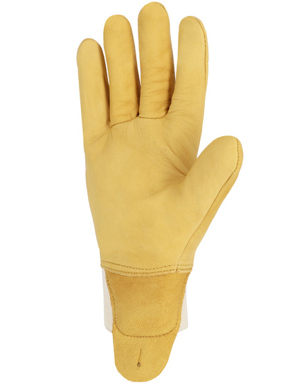 Luva protetora. Couro toda flor de cabra. Costela elástica de borda de pulso com protetor de artéria e botoeira. Edição 'americana'. Polegar de teia. Cor natural.
