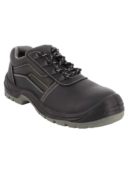 Sapatos SRCSS de segurança S3. Superior: couro repelente de água. Forro: têxtil. Língua: acolchoada, confortável, com golpe e. Dica: aço anti-impacto 200J. Primeira limpeza: EVA antético. Inserção anti-perfuração: aço. Sola: injetou pu densidade dupla. Peso: 590 g (Peso médio de um sapato, tamanho 42).