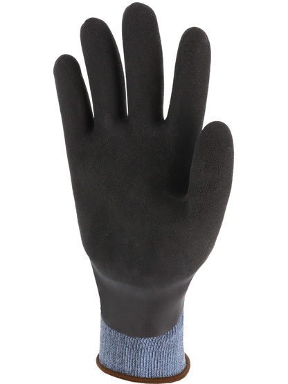 [Manuseio leve em ambientes molhados] Luva protetora. Montagem de malha uma peça (perfeita)." Calibre 13. Suporte de poliamida. Revestimento duplo de látex na palma da mão: - uma camada lisa de cor preta para impermeabilidade. - uma camada preta de areia para agarrar em um ambiente úmido. Para trás, revestida de uma única camada lisa. Pulso elástico de malha.