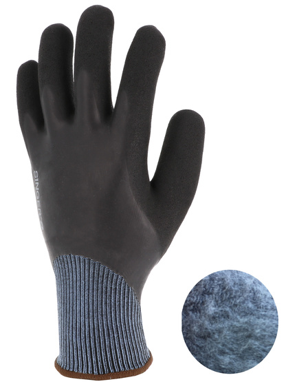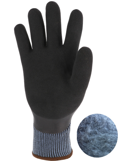 [Proteção a Frio] Luva protetora. Montagem de malha uma peça (perfeita)." Calibre 13. Suporte de nylon. Revestimento duplo de látex na palma da mão: - uma camada lisa de cor preta para impermeabilidade. - uma camada preta de areia para agarrar em um ambiente úmido. Para trás, revestida de uma única camada lisa. Totalmente forrado com uma fivela de acrílico raspada. Pulso elástico de malha.