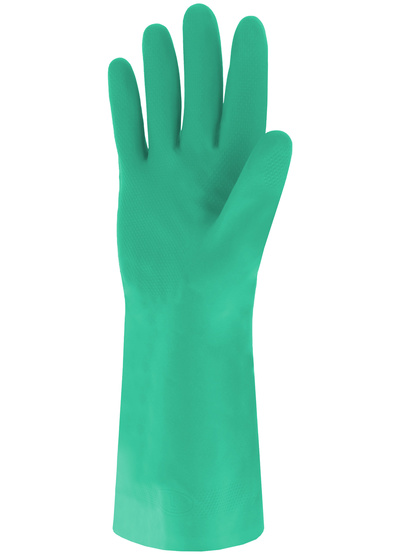 Luva protetora. "Temperado" montagem sem suporte. Revestimento de nitríis. Algodão rebanho. Palm em relevo acabamento. Comprimento: 330 mm. Espessura: 0,38 mm. Cor verde. (*)(*)