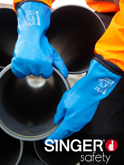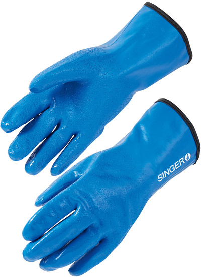 Luva protetora de vários riscos. - Químico (L Tipo C) - Calor - ColdMounting : agente protetor de nitríile costurado com costura, todo revestido. Revestimento em um corte/costura suportam 100% de entrelaçamento de algodão. Inserção de um forro de lã isolante. Acabamento: granulado. Cor: Tamanhos azuis : 9, 10. Comprimento: 300 mm .(*)