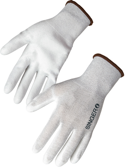 [Luva dissipadora de carga eletrostática] Montagem de peça de malha (sem emenda). Calibre 13. Suporte de poliéster e carbono. A palma da luva é revestida com poliuretano (PU). Pulso elástico de malha. Cor branca.