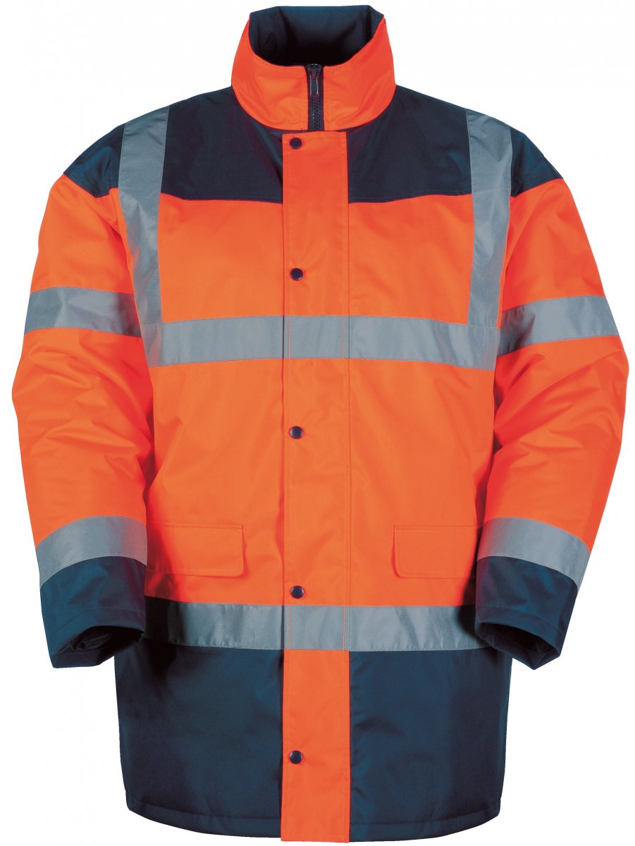 Vestuário de sinalização de grande visibilidade contra as intempéries com bandas retrorefletoras.