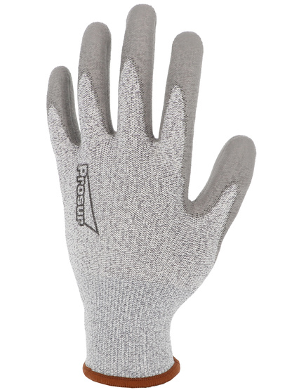 Proteção de corte [Nível de corte do índice D] Luva protetora. Montagem de malha uma peça (sem emenda). Calibre 13. Suporte de fibras de alta resistência hdpe. (HDPE: polietileno de alta densidade). Revestimento flexível de poliuretano (PU) na palma da mão. Arejado de volta. Pulso elástico. Cor cinza.