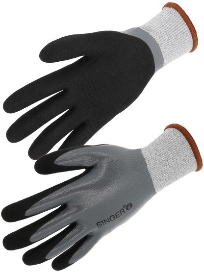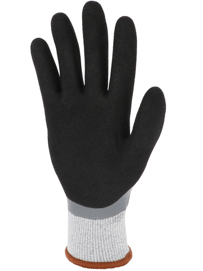 Proteção de corte [Nível de corte do índice D] Revestimento de nitrilho duplo. Luva protetora. Montagem de malha uma peça (sem emenda). Calibre 13. Suporte em fibras HDPE de alta resistência e outras fibras técnicas. (HDPE: polietileno de alta densidade) Qualquer revestimento. Revestimento duplo de nitrida na palma: - uma camada lisa na cor cinza para impermeabilidade - uma camada de areia na cor preta para agarrar em ambientes molhados ou oleosos. Para trás, revestida de uma única camada lisa. Pontas dos dedos revestidas de camada dupla. Pulso elástico. Cor cinza/preta.