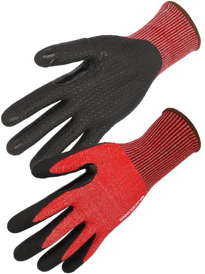 Proteção de corte [Nível de corte nível D] Luva protetora. Montagem de malha uma peça (sem emenda). Calibre 13. Suporte: Mistura HDPE, elastane e outros fios sintéticos. (HDPE: polietileno de alta densidade). Revestimento: nitrilho, acabamento de espuma na palma da mão. Reforço entre polegar e dedo indicador. Pulso elástico. Sobresse em cores. Versão arejada de volta + espinhas nitríil na palma da mão. Cor preto/vermelho.