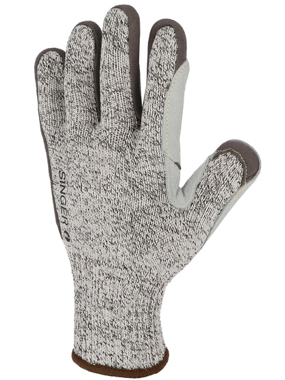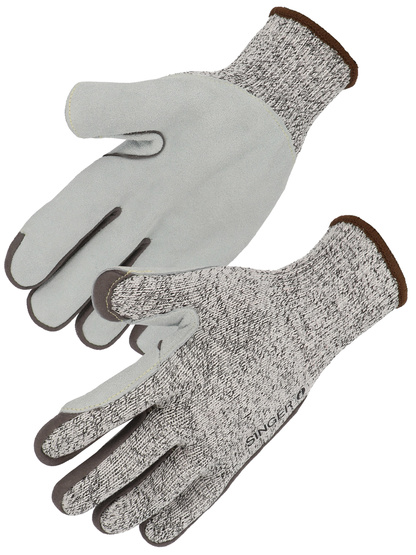 Luva protetora. Calibre 10. Suporte de malha uma peça (sem emenda). Materiais: compostos por fios sintéticos (polietileno de alta densidade, poliéster, poliamida, fibras de vidro, ). Crute de couro na palma da mão e nos dedos. Arejado de volta. Cor: pimenta e sal.