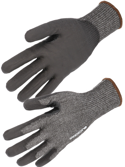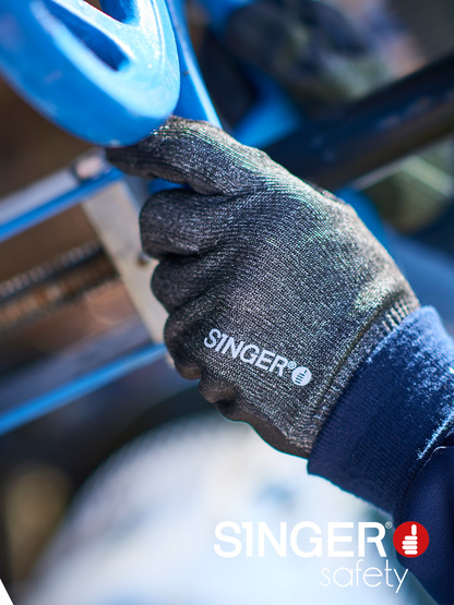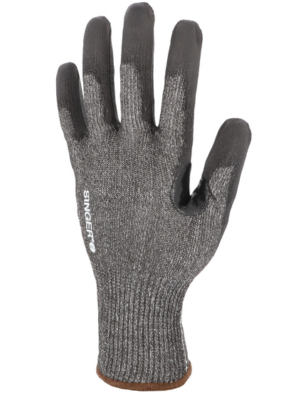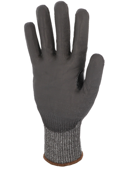 Proteção de corte [Nível de corte de índice F] Luva protetora. Suporte de malha uma peça (sem emenda). Calibre 13. Suporte em fibras HDPE de alta resistência e outras fibras técnicas. (POLIEtileno de alta densidade HDPE). Revestimento flexível de poliuretano na palma da mão. Reforço de nitrilha entre polegar e dedo indicador. Pulso elástico. Cor cinza/preta.