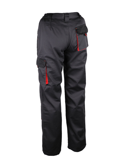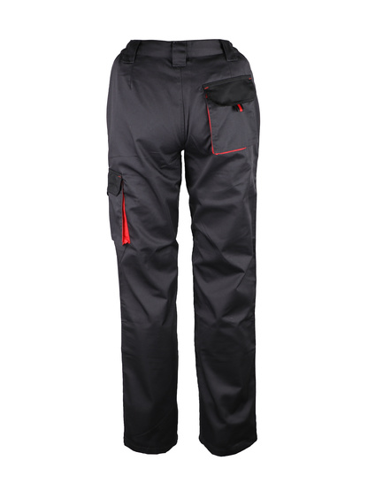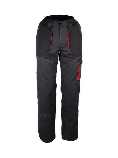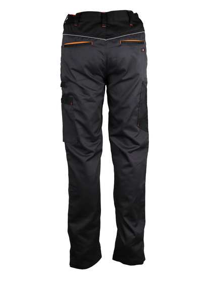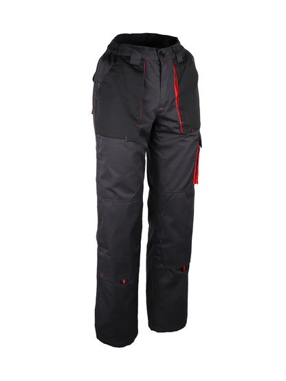 65% poliéster / 35% algodão. 245 g/m2 Fixação elástica na cintura nas laterais. Braguette com zíper e um botão. Transeuntes de cintos. 2 bolsos em um ângulo para a cintura. Um bolso na perna esquerda. Um bolso traseiro. Bolsos de joelheiras.